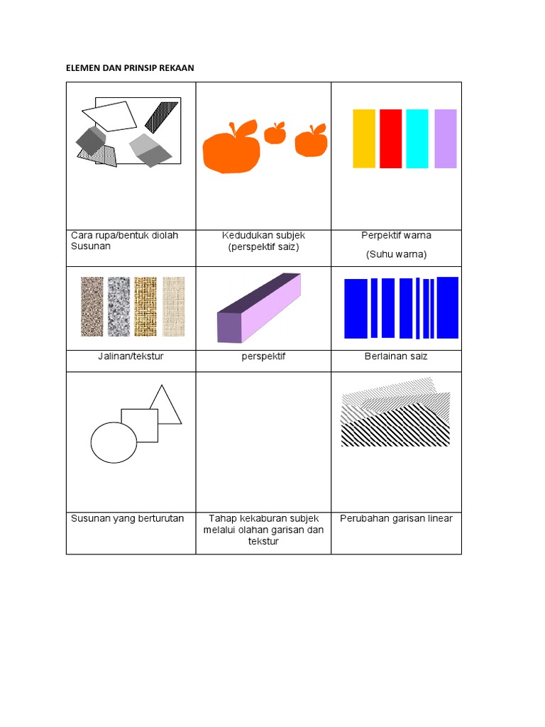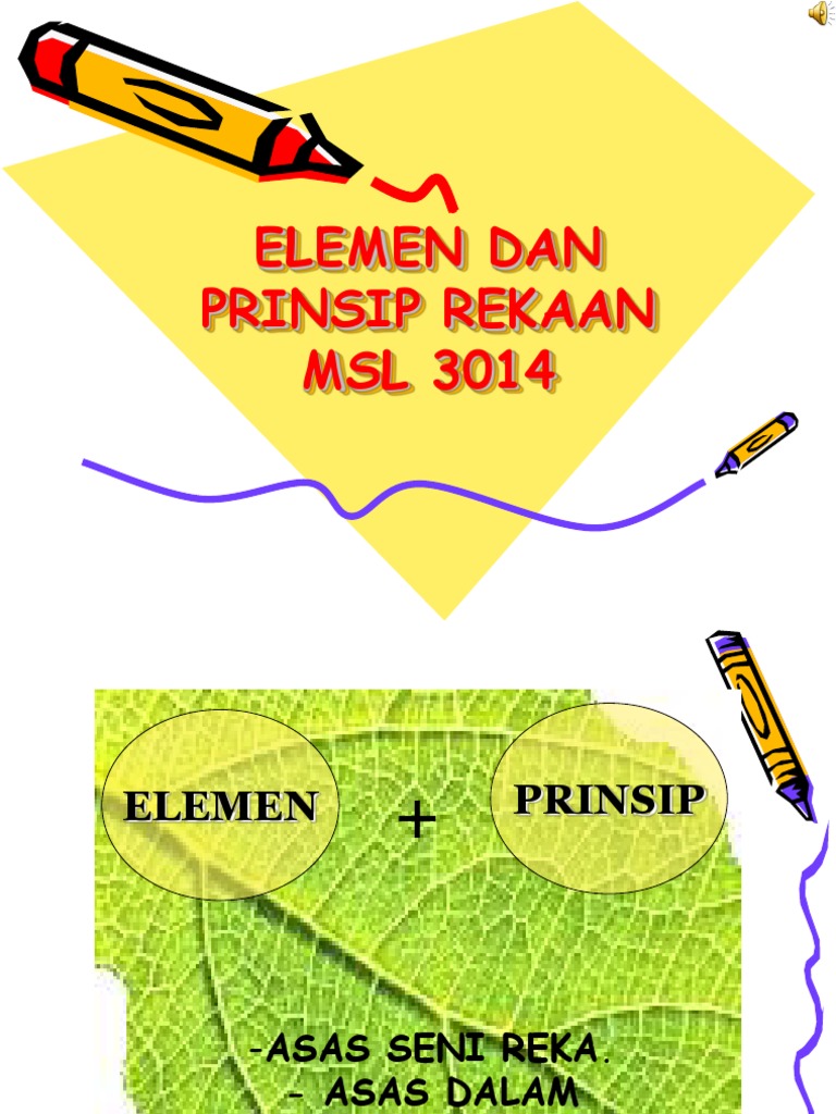 Di dalam disiplin seni visual, aspek formalnya terbahagi kepada dua perkara iaitu unsur /elemen seni visual dan prinsip seni visual. Text of bab 1 elemen dan prinsip senireka. Jendela merupakan elemen dari desain arsitektur dan interior yang menghubungkan, baik secara visual dan fisik, satu ruang ke ruang lain maupun bagian dalam ruangan dengan ruang luar seperti halaman ataupun view lainnya. Jendela merupakan salah satu bagian terang pada dinding sebagai. Pengulangan elemen seperti warna, jalinan, nilai dan sebagainya memberi penyesuaian kepada pertentangan yang wujud.