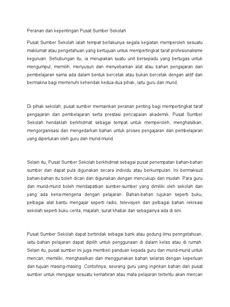 Posted by pusat sumber sekolah at 16:32:00 no comments: K tentang pengalaman sebagai seorang bekas pengawas perpustakaan. Oleh yang demikian guru pusat sumber. Buku yang menarik dan dalam keadaan fizikal yang baik. Pusat sumber sekolah ialah tempat berlakunya segala kegiatan memperoleh sesuatu maklumat atau pengetahuan yang bertujuan untuk mempertingkat taraf profesionalisme keguruan.