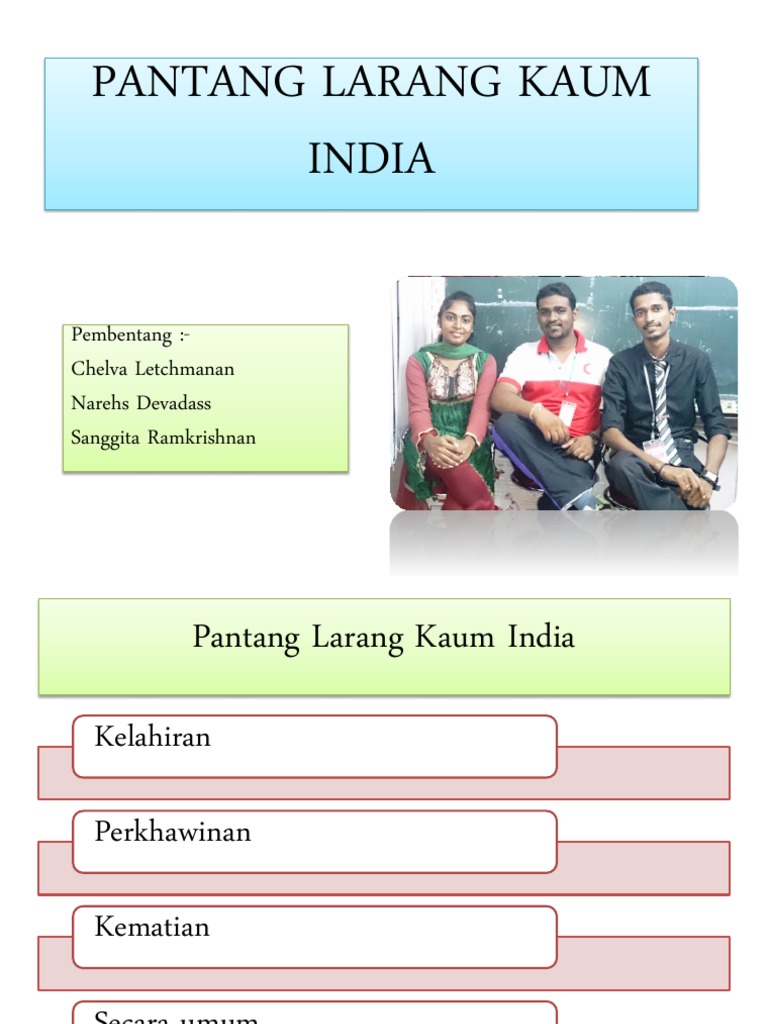 Inilah menunjukkan malaysia terdiri daripada kaum majmuk. Pantang larang kaum melayu, cina dan india. Pantang larang semasa mengandung bagi kaum india. Salah satu kaum di malaysia yang mempunyai banyak pantang larang yang diamalkan. Adat kematian agama hindu adat kematian agama hindu.