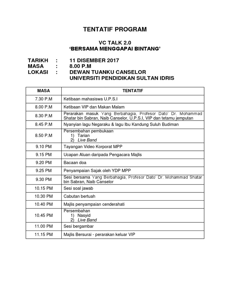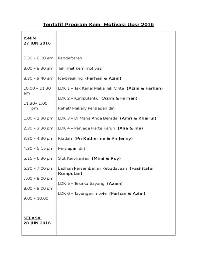 Aturcara program adalah bergantung kepada pakej yang dipilih. Contextual translation of tentatif program into english. Class sizes are kept small and instruction is interactive, giving you the opportunity to receive individualized. Jadi, ccmb tahun ni lebih banyak mengadakan program outdoor (memanfaatkan sepenuhnya musim bunga yang cantik ni di luar) selain itu, kami juga ingin meraikan penubuhan lajnah baru ppimi iaitu lajnah belia dan sukan. Our courses, ranging from beginner to advanced levels, focus on developing each.