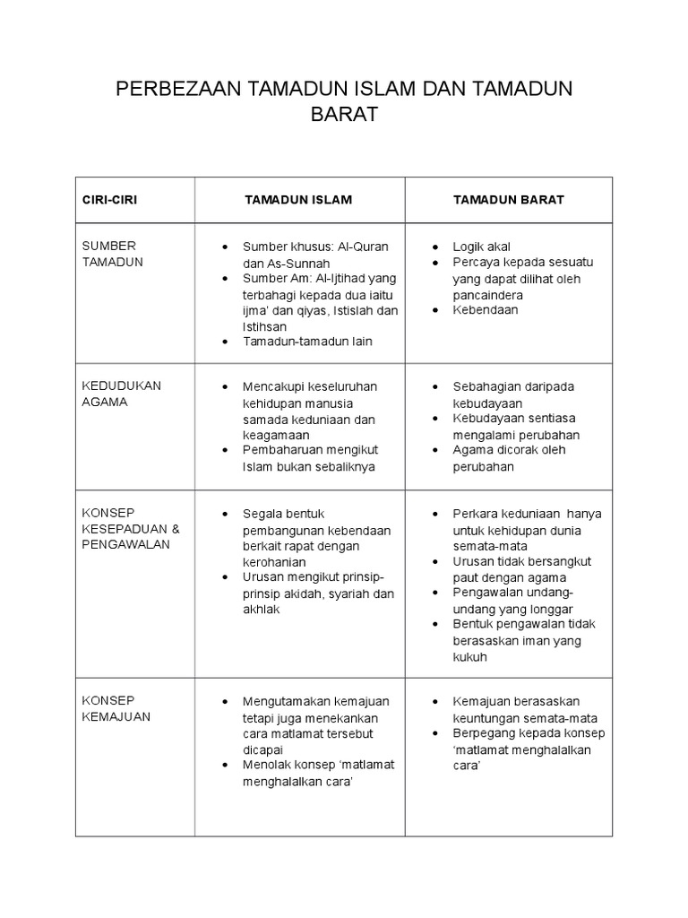 • segala perilaku dan perbuatan mestilah berteraskan keimanan untuk membina tamadun yang kukuh dan disegani. Beliau memperkenalkan konsep tamadun, iaitu umran dan hadharah yang digunakan dalam bukunya yang bertajuk muqqadimah. Perbezaan ini merangkumi semua aspek iaitu pandangan semesta terhadap tuhan, manusia serta alam. Bandingkan maksud perkataan tamadun dalam bahasa yunani, bahasa inggeris dan bahasa arab. Dalam agama islam, kepercayaan hanya diletakkan kepada tuhan yang satu. Bergaul dalam islam memiliki cara tersendiri dimana syariat tersebut akan menjadikan manfaat dan mencegah dari berbagai perbuatan maksiat atau keburukan (hr malik, tirmizi dan nasa'i). Siti khasinah (2013) meneliti tentang hakekat manusia menurut pandangan islam dan barat. Agama islam tidak pernah membatalkan. Tamadun mengikut pandangan islam merangkumi pembangunan lahiriah外在 dan rohaniah内在 yang berasaskan nilai dalam pendidikan seperti yang disarankan oleh. Dalam islam, mempercayai adanya kekuatan lain yang dapat memberikan mudharat kepada seseorang atau masyarakat selain allah subhanahu wa ta'ala ialah suatu perbuatan syirik dan hukumnya haram. Kedatangan islam membawa kepada perkembangan tamadun. Islam telah melahirkan antara tamadun manusia kehebatan tamadun islam telah mengubah arah kegelapan tamadun barat menjadi sebuah beberapa persoalan adakah tamadun barat yang bangkit daripada tamadun islam boleh di sama. Konsep tamadun menurut pandangan islam dan barat.
