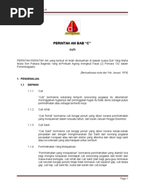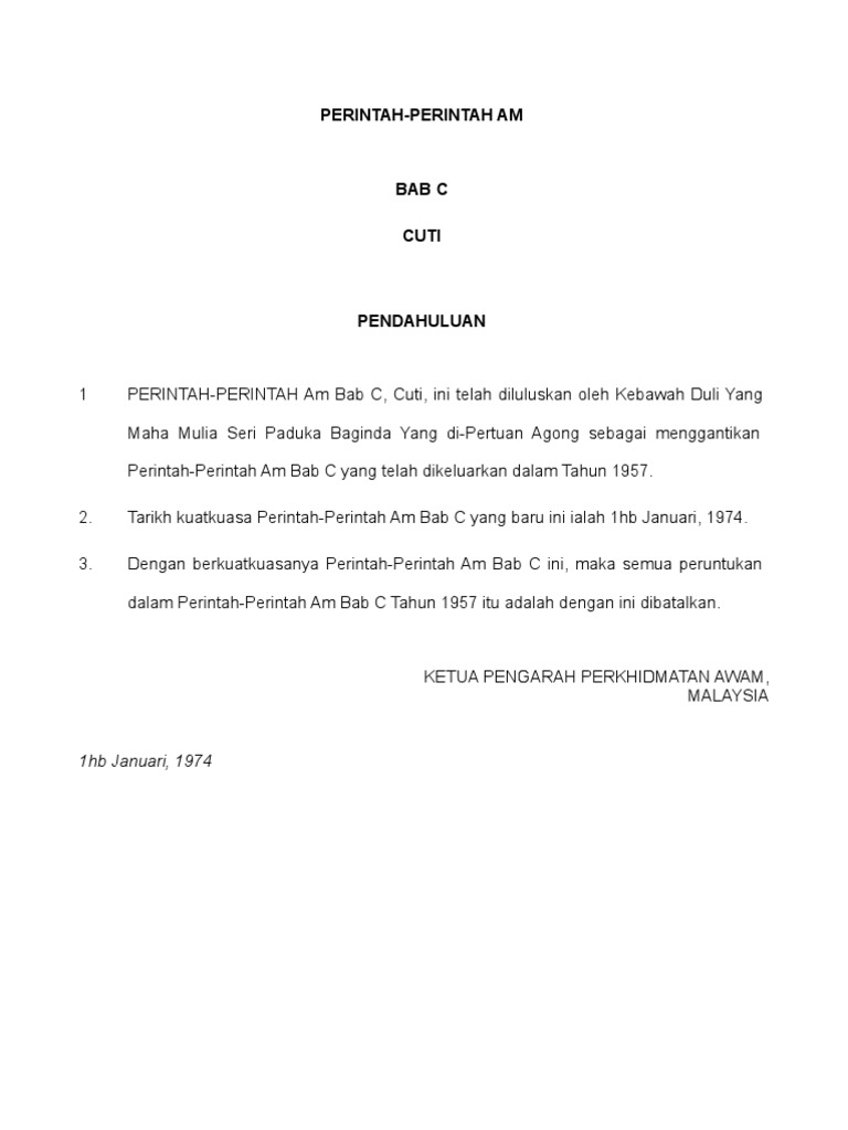 Kursus pengurusan pentadbiran dan perkhidmatan di institusi sekolah. Savesave perintah am bab c for later. Share transcript perintah am bab 'c' jabatan perkhidmatan awammalaysia pengurusan cuti pegawai perkhidmatan awam 2 perintah ambab 'c' 1974 perintah am bab 'c'pekeliling perkhidmatan & surat pekeliling perkhidmatan sumber dasar dan. Perintah papers and research , find free pdf download from the original pdf search engine. 19 cuti separuh gaji kadar syarat perintah am 13 bab c kadar 30 hari bagi setiap genap setahun perkhidmatan tidak melebihi 180 hari syarat berdasarkan perkhidmatan yang melayakkan;